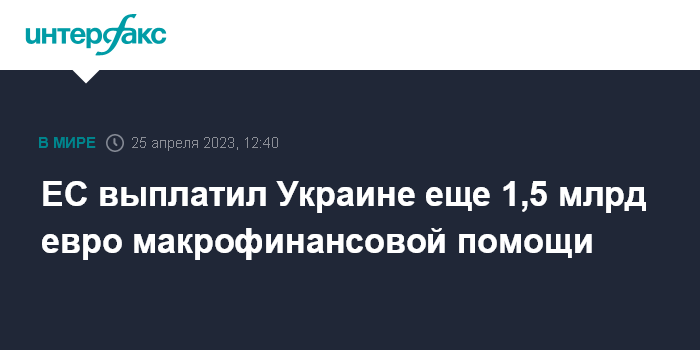 Москва. 25 апреля. INTERFAX.RU - Евросоюз во вторник направил Киеву очередной транш макрофинансовой помощи в размере 1,5 млрд евро из запланированных на 2023 год 18 млрд, заявила председатель Еврокомиссии Урсула фон дер Ляйен.