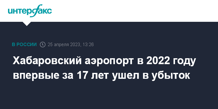 Москва. 25 апреля. INTERFAX.RU - АО "Хабаровский аэропорт" (оператор по наземной деятельности в аэропорту Хабаровска) в 2022 году получило 116 млн рублей чистого убытка по РСБУ против 211 млн рублей чистой прибыли годом ранее, сообщается в отчетности компании.