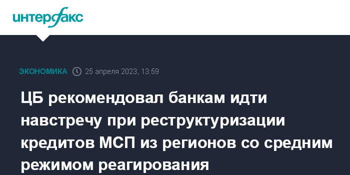 Москва. 25 апреля. INTERFAX.RU - ЦБ РФ рекомендовал банкам и микрофинансовым организациям идти навстречу малым и средним предприятиям из регионов, в которых действует средний уровень реагирования, при реструктуризации кредитов.