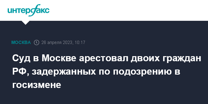 Москва. 26 апреля. INTERFAX.RU - Лефортовский суд Москвы по ходатайству следствия на минувшей и текущей неделе отправил под арест двоих граждан РФ, которым вменяется государственная измена, сообщили "Интерфаксу" в пресс-службе суда.