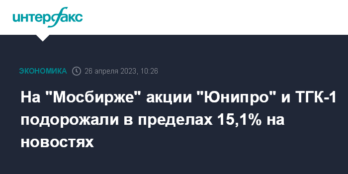 Москва. 26 апреля. INTERFAX.RU - В начале торгов среды на "Московской бирже" акции "Юнипро" подорожали на 15,1%, до 2,25 рубля за штуку, а бумаги "ТГК-1" подорожали на 11,3%, до 0,01025 рубля за штуку, на новостях о передаче Росимуществу во временное управление активов Uniper SE и Fortum.