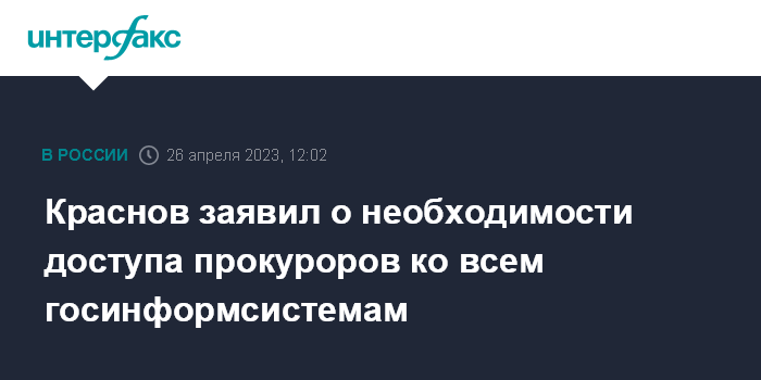 Москва. 26 апреля. INTERFAX.RU - Руководитель Генпрокуратуры России Игорь Краснов считает, что прокуроры должны иметь постоянный доступ ко всем государственным информационным системам. Он сказал об этом, выступая с докладом в Совете Федерации и подтвердил актуальность вопроса.
