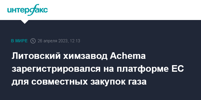Москва. 26 апреля. INTERFAX.RU - Крупнейший потребитель газа в Литве – производитель азотных удобрений Achema – зарегистрировался на созданной Евросоюзом платформе для совместных закупок газа странами ЕС.