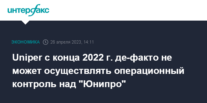 Uniper с конца 2022 г. де-факто не может осуществлять операционный контроль над "Юнипро"