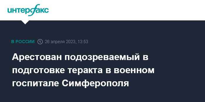 Москва. 26 апреля. INTERFAX.RU - Районный суд в Симферополе отправил под стражу россиянина, подозреваемого в подготовке теракта в местном Военно-морском клиническом госпитале, сообщили "Интерфаксу" в пресс-службе УФСБ по Крыму и Севастополю в среду.