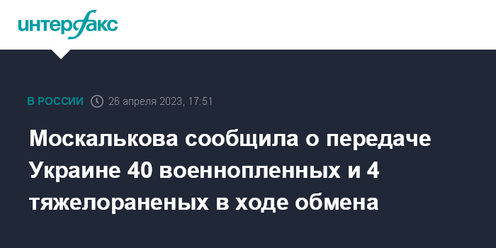 Москва. 26 апреля. INTERFAX.RU - Минобороны РФ в ходе обмена в среду передало Украине 40 военнопленных, а также четырех тяжелораненых украинских военнослужащих, сообщила уполномоченная по правам человека в РФ Татьяна Москалькова.