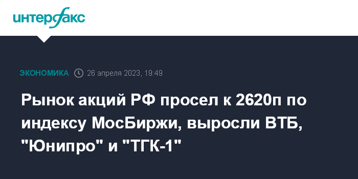 Москва. 26 апреля. INTERFAX.RU - Рынок акций РФ в среду просел вслед за подешевевшей нефтью и на фоне смешанных сигналов с внешних фондовых площадок; индекс МосБиржи просел к 2620 пунктам, зафиксировав умеренное снижение по итогам третьих торгов подряд. Выросли акции ВТБ (+4,2%) на корпоративных новостях, также подросли бумаги "Юнипро" (+5,4%) и "ТГК-1" (+5,1%) на сообщениях о передаче Росимуществу в управление долей нерезидентов в компаниях.