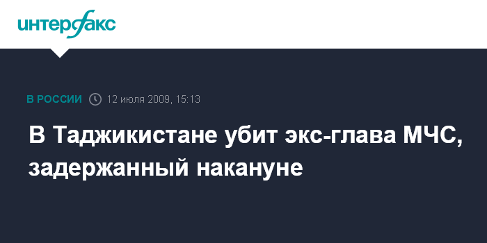 Душанбе. 12 июля. INTERFAX.RU - Бывший министр по чрезвычайным ситуациям Таджикистана генерал-лейтенант Мирзо Зиёев, который в годы гражданской войны был видным полевым командиром оппозиции, убит в субботу вечером в ходе спецоперации МВД и Госкомитета нацбезопасности, говорится в официальном сообщении МВД, распространенном в воскресенье.