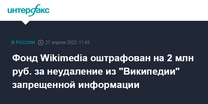 Это уже седьмой штраф Wikimedia в 2023 году за неудаление подлежащей удалению информации. Общая сумма штрафов, назначенных фонду за семь правонарушений, составляет 8,4 млн руб.