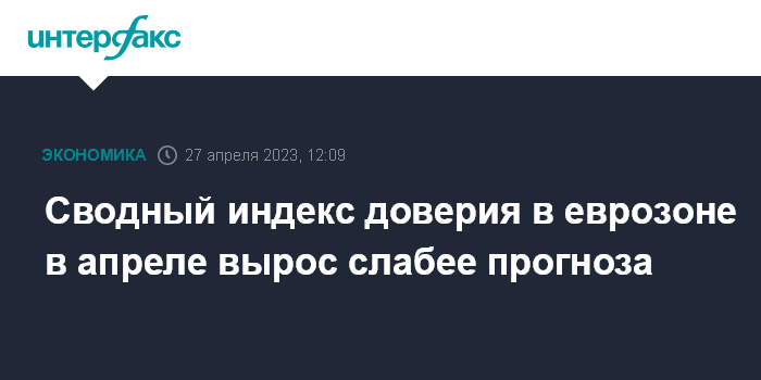 Москва. 27 апреля. INTERFAX.RU - Сводный индекс делового и потребительского доверия в еврозоне в апреле составил 99,3 пункта по сравнению с пересмотренными 99,2 пункта месяцем ранее, свидетельствуют данные Европейской комиссии.