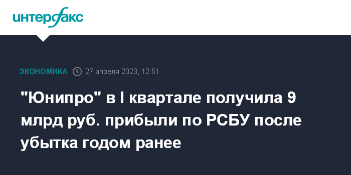 "Юнипро" в I квартале получила 9 млрд руб. прибыли по РСБУ после убытка годом ранее