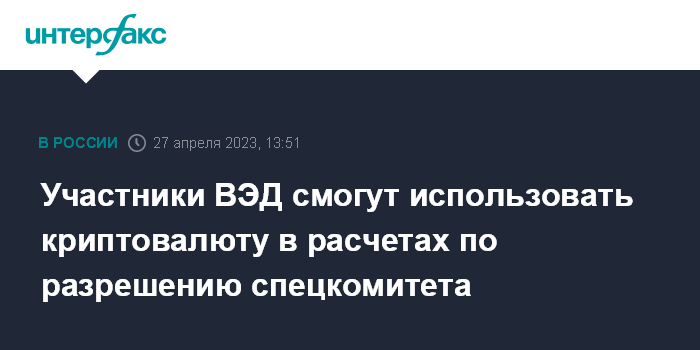 Москва. 27 апреля. INTERFAX.RU - Участники внешнеэкономической деятельности смогут использовать в расчетах криптовалюту, если получат разрешение специального комитета, который будет создан в рамках формируемого экспериментального правового режима, рассказал замглавы Минфина Алексей Моисеев.