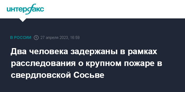 Москва. 27 апреля. INTERFAX.RU - Двух жителей Свердловской области задержали в рамках расследования обстоятельств произошедшего на этой неделе в поселке Сосьва масштабного пожара, сообщается в четверг на сайте Следственного комитета РФ.