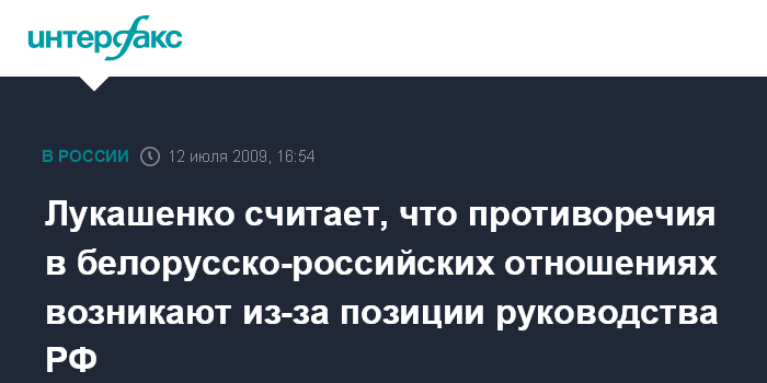 Минск. 12 июля. INTERFAX.RU - Противоречия в белорусско-российских отношениях вызваны позицией российского руководства, заявил президент Белоруссии Александр Лукашенко в интервью австрийской газете Die Presse.