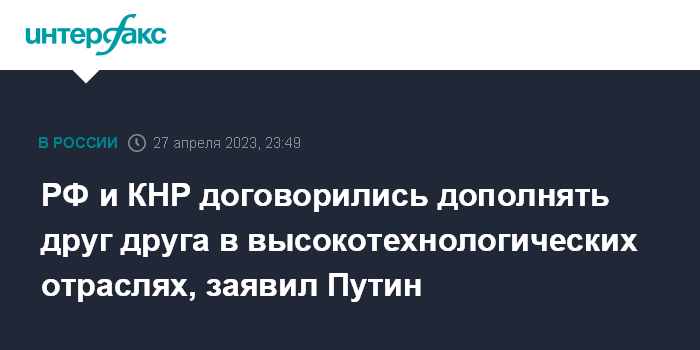 РФ и КНР договорились дополнять друг друга в высокотехнологических отраслях, заявил Путин
