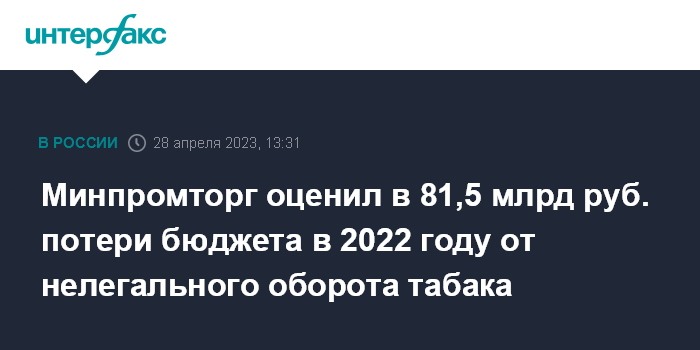 Москва. 28 апреля. INTERFAX.RU - В 2022 году ущерб бюджету России от нелегального оборота табака составил 81,5 млрд рублей, сообщил и.о. директора департамента системы цифровой маркировки товаров Минпромторга Владислав Заславский. Он сказал это на круглом столе о борьбе с нелегальной торговлей табаком и никотиносодержащей продукцией.