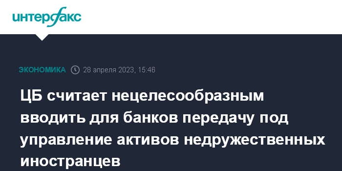 ЦБ считает нецелесообразным вводить для банков передачу под управление активов недружественных иностранцев