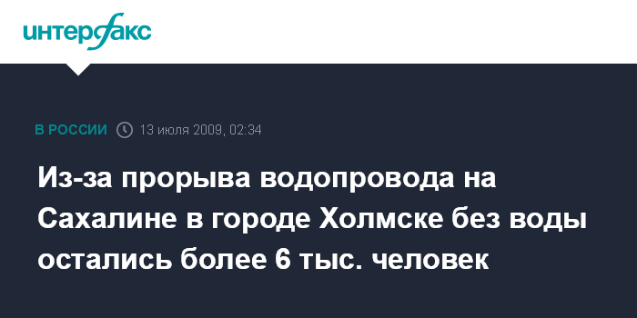 Южно-Сахалинск. 13 июля. ИНТЕРФАКС-ДАЛЬНИЙ ВОСТОК - В результате проседания грунта более 6 тыс. жителей города Холмска острова Сахалин остались без водоснабжения.