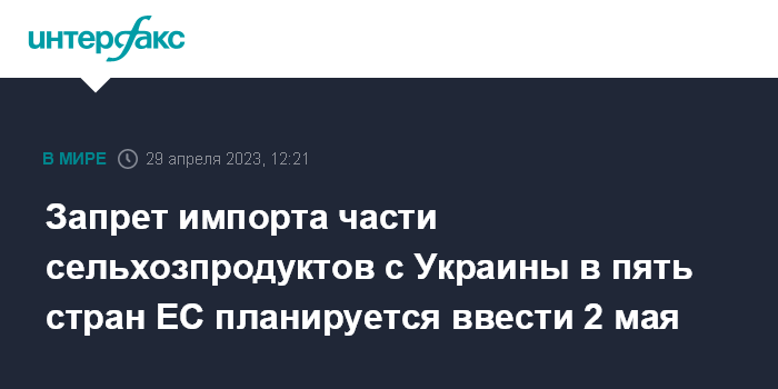 Запрет импорта части сельхозпродуктов с Украины в пять стран ЕС планируется ввести 2 мая