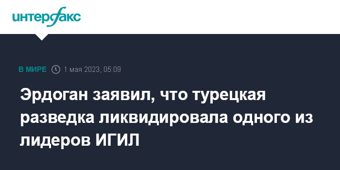 Москва. 1 мая. INTERFAX.RU - Национальная разведка Турции в ходе спецоперации в Сирии ликвидировала лидера ИГИЛ ("Исламское государство", запрещенная в РФ террористическая организация) Абу Хусейна аль-Курейши, сообщил турецкий президент Реджеп Тайип Эрдоган.
