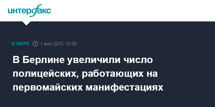 Москва. 1 мая. INTERFAX.RU - Присутствие полицейских в Берлине увеличено до 6,3 тыс. сотрудников в связи с планируемыми на понедельник первомайскими демонстрациями, сообщает Польское телевидение со ссылкой на берлинскую полицию.