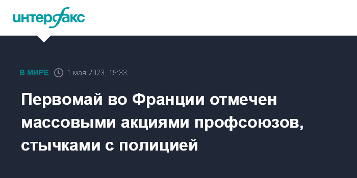 Москва. 1 мая. INTERFAX.RU - Более 300 манифестаций под знаком несогласия с пенсионной реформой проходило во Франции по случаю 1 мая, сообщают французские СМИ.