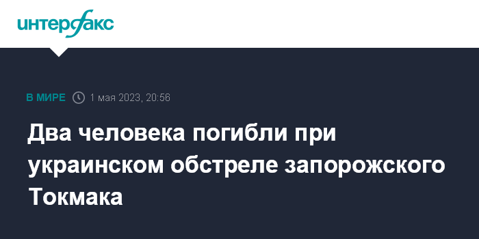 Москва. 1 мая. INTERFAX.RU - Город Токмак Запорожской области попал под обстрел со стороны вооруженных сил Украины, два человека погибли, сообщил журналистам представитель экстренных служб региона.