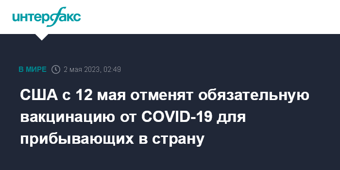Москва. 2 мая. INTERFAX.RU - Администрация США анонсировала отмену с 12 мая требования об обязательной вакцинации от коронавируса для прилетающих в страну иностранных граждан.