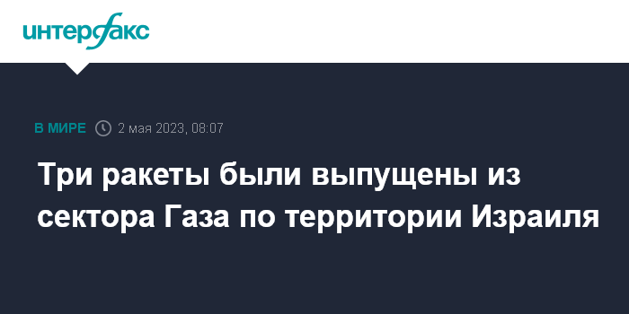 Москва. 2 мая. INTERFAX.RU - Три ракеты были выпущены по Израилю во вторник с территории сектора Газа, сообщила Армия обороны Израиля (ЦАХАЛ) в соцсети.