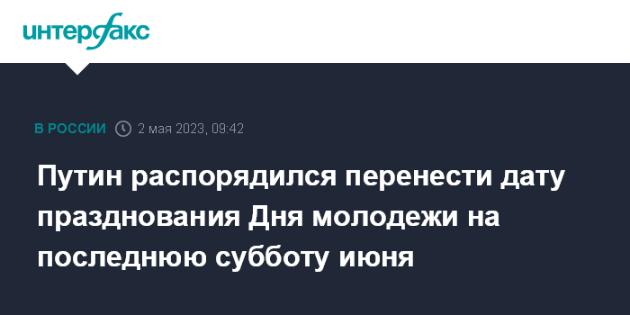 Москва. 2 мая. INTERFAX.RU - Президент РФ Владимир Путин подписал распоряжение, согласно которому празднование Дня молодежи переносится на последнюю субботу июня.