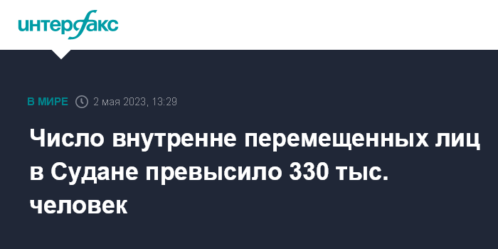 Москва. 2 мая. INTERFAX.RU - Число внутренне перемещенных лиц в Судане превысило 330 тыс. человек, более 100 тыс. покинули страну, сообщает во вторник Associated Press со ссылкой на международную организацию по миграции.