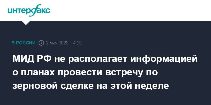 Москва. 2 мая. INTERFAX.RU - В Москве не располагают информацией о планирующейся на этой неделе встрече участников "зерновой сделки", сообщили во вторник в МИД России.