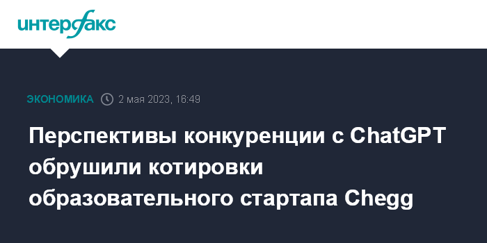 Москва. 2 мая. INTERFAX.RU - Цена бумаг Chegg Inc., предоставляющей различные образовательные услуги онлайн, падает на 45% в начале торгов во вторник после того, как руководство компании дало слабый прогноз на второй квартал из-за опасений конкуренции со стороны чат-бота на основе искусственного интеллекта ChatGPT.