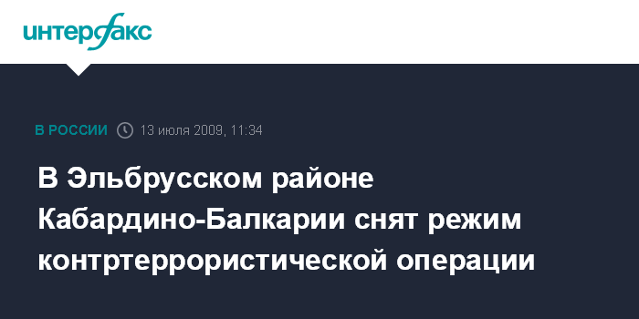 Москва. 13 июля. INTERFAX.RU - В Эльбрусском районе Кабардино-Балкарии с 6:00 мск понедельника отменили режим контртеррористической операции (КТО), введенный 30 июня.