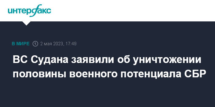 Москва. 2 мая. INTERFAX.RU - Вооруженные силы Судана за 16 дней боев с "Силами быстрого реагирования" (СБР) смогли примерно наполовину сократить их военный потенциал, сообщает "Аль-Арабийя" со ссылкой на заявление суданских военных.