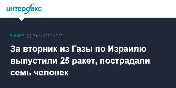 Москва. 2 мая. INTERFAX.RU - Из сектора Газа за вторник запустили не менее 25 ракет по Израилю, семь гражданских израильтян получили ранения, сообщает The Jerusalem Post.
