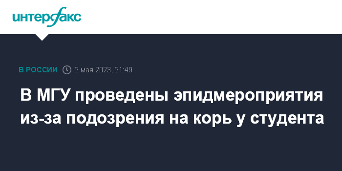 Москва. 2 мая. INTERFAX.RU - В Московском государственном университете им. Ломоносова зарегистрирован случай подозрения на корь у студента, руководству вуза направлено предписание принять все необходимые противоэпидемические меры, сообщили в столичном управлении Роспотребнадзора.