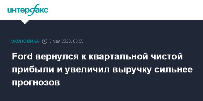 Москва. 3 мая. INTERFAX.RU - В I квартале 2023 года американский автопроизводитель Ford Motor получил чистую прибыль, а его выручка и скорректированная прибыль существенно превысили прогнозы рынка.