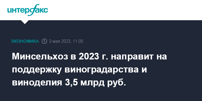 Москва. 3 мая. INTERFAX.RU - Министерство сельского хозяйства РФ в 2023 году выделит 3,5 млрд рублей на поддержку виноградарства и виноделия. Об этом сообщила заместитель директора департамента пищевой и перерабатывающей промышленности Минсельхоза РФ Ирина Федина.