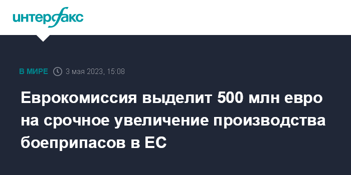 Москва. 3 мая. INTERFAX.RU - Еврокомиссия (ЕК) утвердила законодательное предложение о поддержке производства боеприпасов европейской промышленностью в соответствии с планом срочных поставок снарядов и ракет Украине и пополнения государствами-членами ЕС собственных запасов, на что ЕК выделит 500 млн евро.