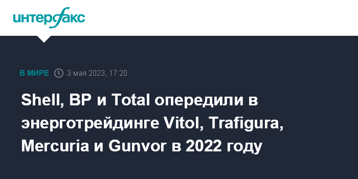 Shell, BP и Total опередили в энерготрейдинге Vitol, Trafigura, Mercuria и Gunvor в 2022 году