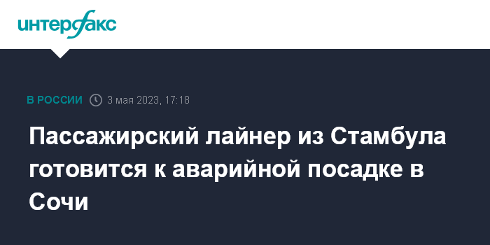 Москва. 3 мая. INTERFAX.RU - Пассажирский лайнер, направляющийся из Стамбула, готовится к аварийной посадке в Сочи из-за технических проблем, сообщили "Интерфаксу" в экстренных службах.
