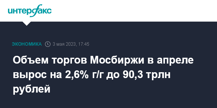 Москва. 3 мая. INTERFAX.RU - Совокупный объем торгов на рынках "Московской биржи" в апреле 2023 года увеличился по сравнению с апрелем 2022 года на 2,6%, до 90,3 трлн рублей с 88,0 трлн рублей, сообщается в пресс-релизе биржи.
