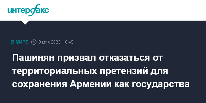 Москва. 3 мая. INTERFAX.RU - Армения должна заявить об отказе от каких-либо территориальных претензий, в противном случае лишится государственности, заявил премьер-министр Армении Никол Пашинян.