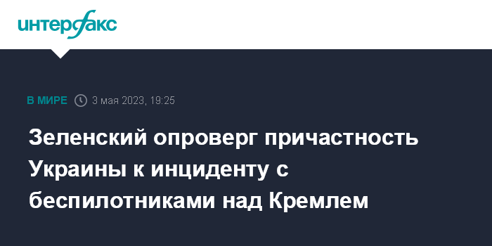 Москва. 3 мая. INTERFAX.RU - Президент Украины Владимир Зеленский в среду заявил, что Киев не имеет отношения к попытке удара беспилотниками по кремлевской резиденции президента России.