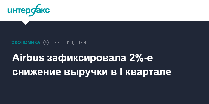 Москва. 3 мая. INTERFAX.RU - Европейская аэрокосмическая корпорация Airbus SE зафиксировала 2%-е снижение выручки в первом квартале 2023 года, однако показатель превзошел прогнозы рынка.
