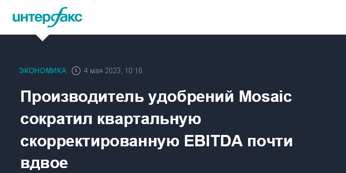 Москва. 4 мая. INTERFAX.RU - В I квартале 2023 года скорректированная EBITDA Mosaic Co., одного из крупнейших в мире производителей удобрений, упала почти вдвое в годовом исчислении, до $777 млн, сообщила компания.