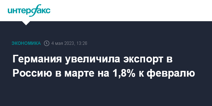 Москва. 4 мая. INTERFAX.RU - В марте 2023 года Германия увеличила экспорт в Россию на 1,8% по сравнению с февралем - до 900 млн евро, показали данные Федерального статистического управления ФРГ (Destatis).
