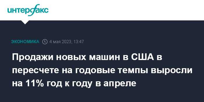 Москва. 4 мая. INTERFAX.RU - Продажи новых автомобилей в США в пересчете на годовые темпы и с поправкой на сезонные колебания (SAAR) выросли в апреле на 11% в годовом и на 7% в помесячном выражении, полагают аналитики компании Cox Automotive.