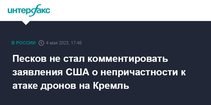 Москва. 4 мая. INTERFAX.RU - Пресс-секретарь президента РФ Дмитрий Песков не стал комментировать высказывания представителя Совета национальной безопасности США Джона Кирби, который заявил о непричастности Вашингтона к атаке беспилотников на Кремль.